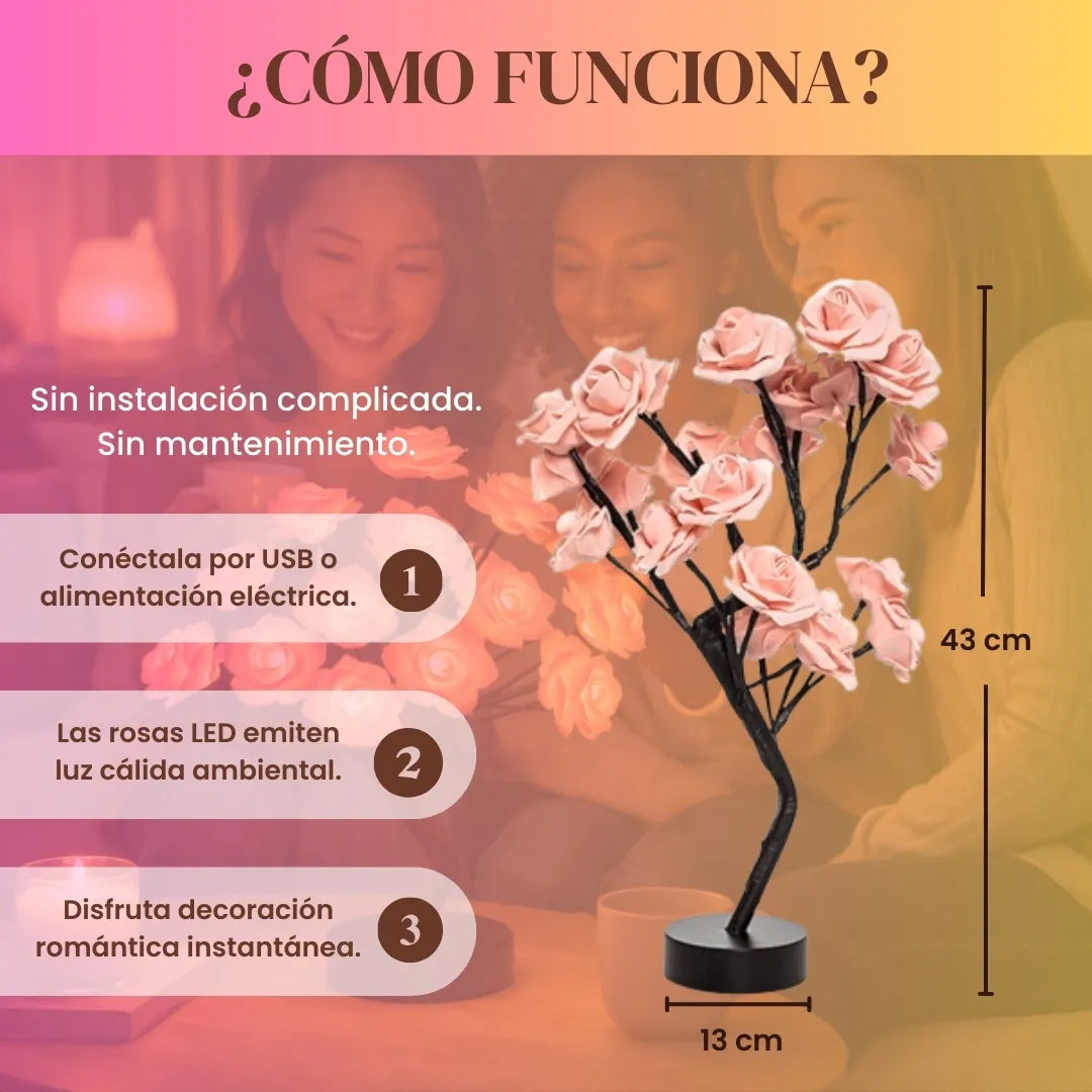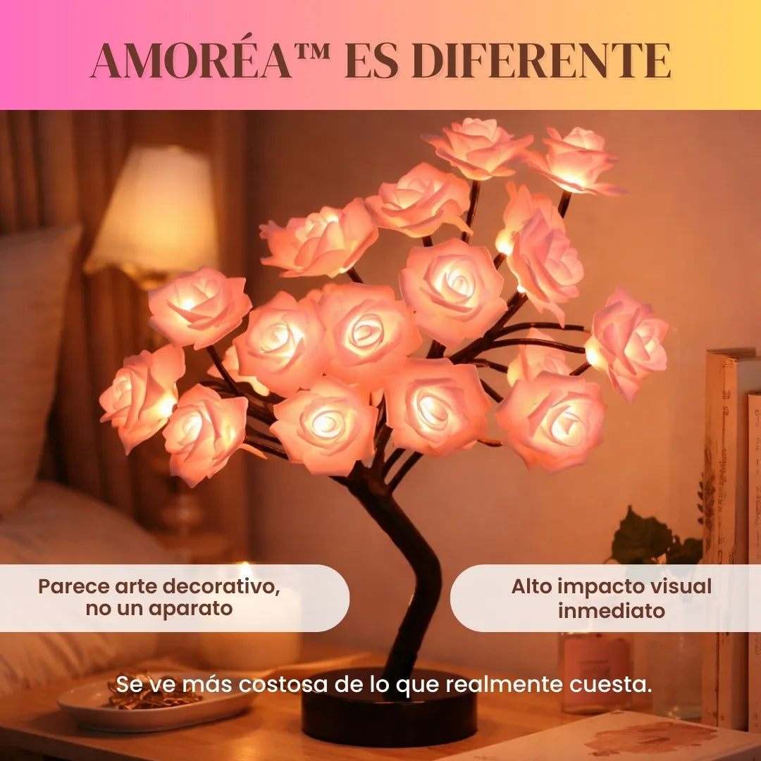 Su diseño tipo árbol con rosas iluminadas hace que Amoréa™ se perciba como una pieza decorativa premium. Los diseños ornamentales elevan el valor percibido hasta en un 70% frente a lámparas comunes. Apagada decora, encendida transforma el ambiente.