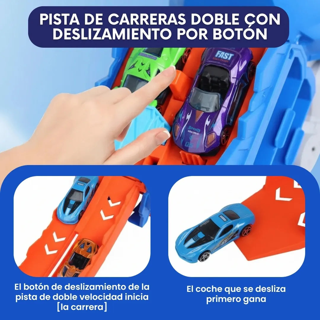 El DinoCar incluye una pista de carrera doble con sistema de deslizamiento por botón, para que dos autos salgan al mismo tiempo en una carrera llena de emoción.