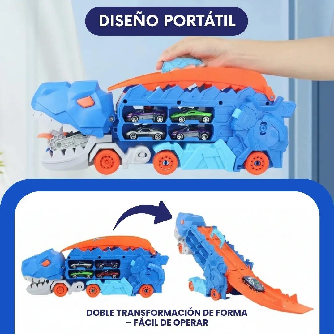 El DinoCar 3 en 1 combina camión transportador, pista de carrera y dinosaurio devorador de autos. ¡Un juguete transformable que multiplica la diversión y estimula la imaginación de tu hijo en más del 200 %!