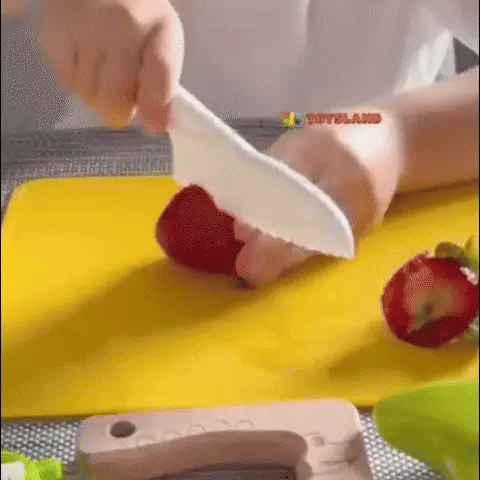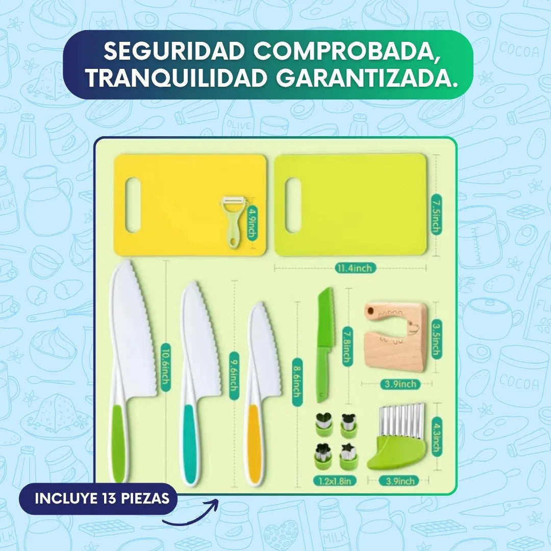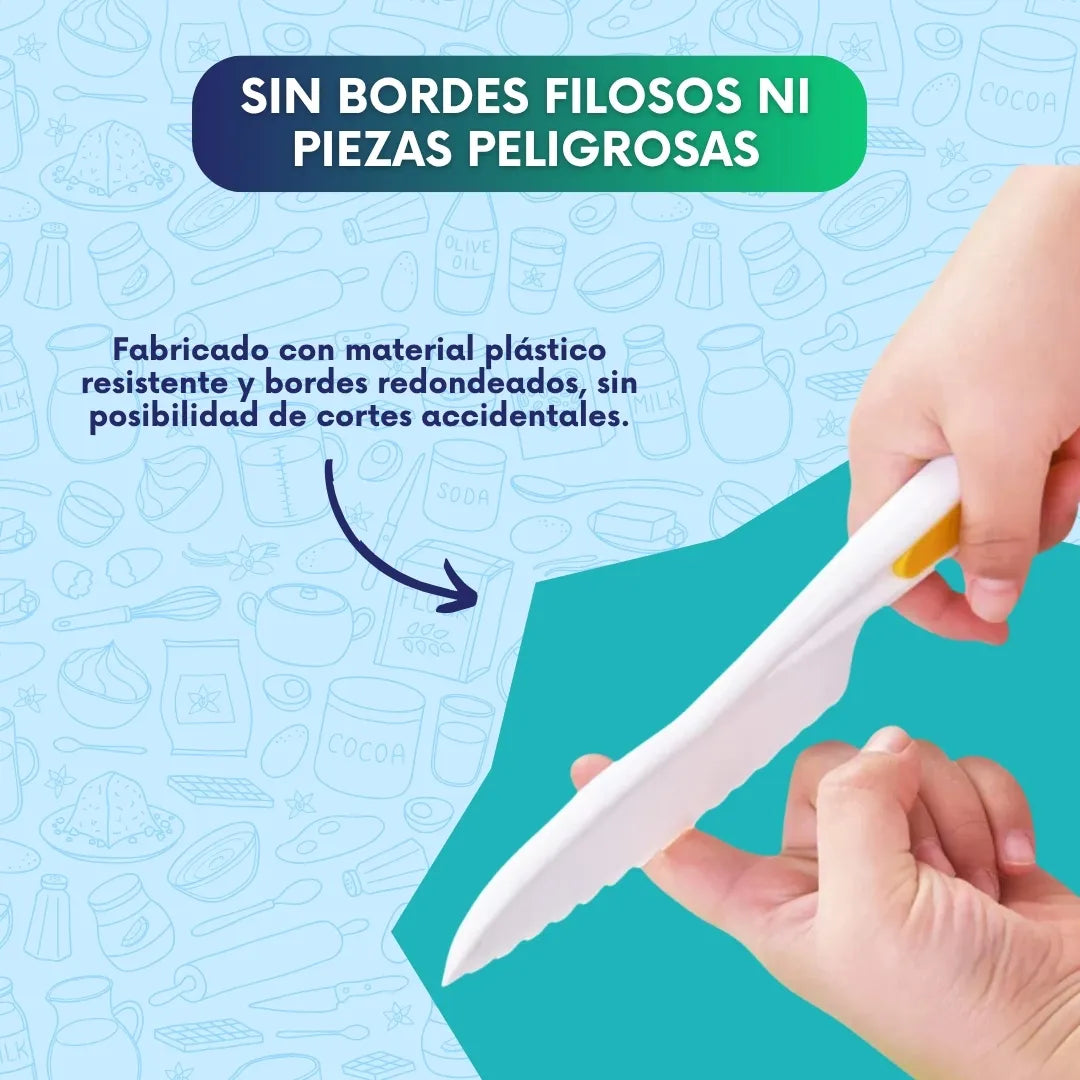 Cada utensilio de MiniChef™ está diseñado pensando en la seguridad de los más pequeños: materiales suaves, bordes redondeados y puntas seguras para que puedan explorar, cortar y amasar sin riesgo.