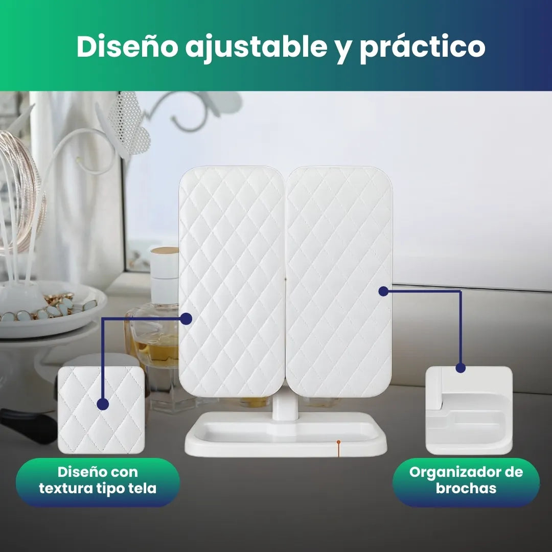 Mientras otros espejos tienen mala luz, sin aumento y no permiten ver todo el rostro, MirrorGlam ofrece una experiencia completa con iluminación profesional, ángulo ajustable y diseño plegable.