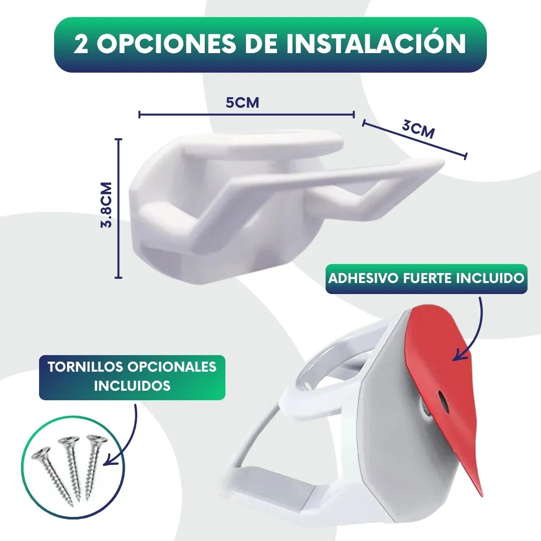 Los ganchos vienen con adhesivo fuerte tipo 3M. Solo retirás el protector, pegás en una superficie limpia y listo.