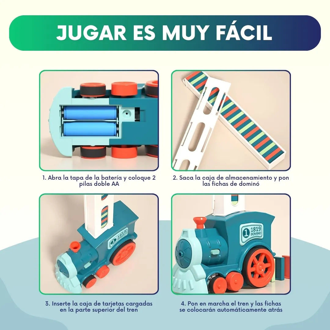 Solo coloca las fichas en el cargador, presiona el botón y mira cómo el tren las acomoda automáticamente. ¡Diversión sin esfuerzo!